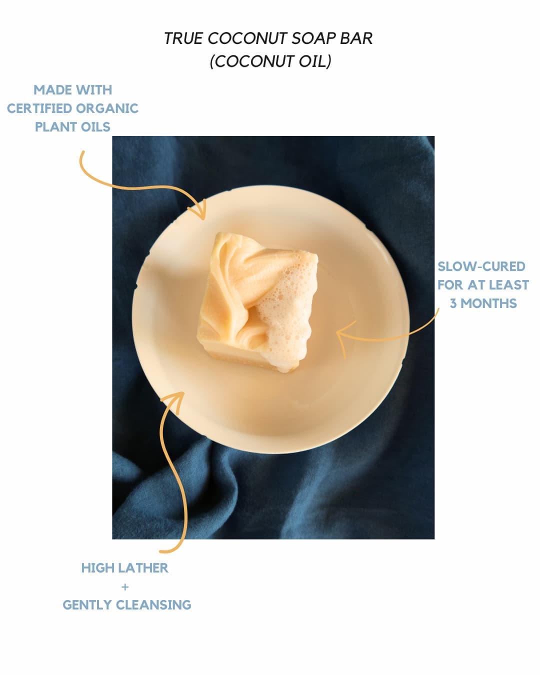 True Coconut Soap is one of our most cleansing soap bars made with certified organic plant oils to gently lather and clean your skin. This soap bar contains only 3 ingredients – virgin coconut oil (certified organic), water, and food grade sodium hydroxide.